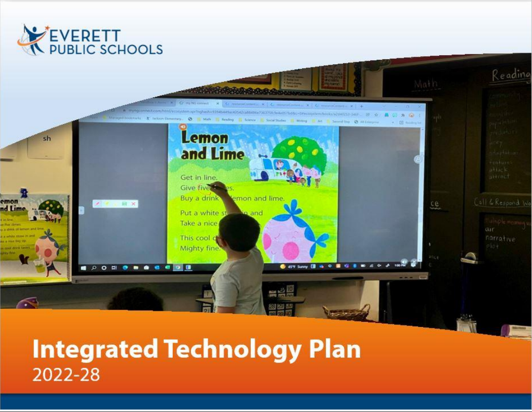 Everett Public Schools’ second iteration of the Integrated Technology Plan (ITP) spans 2022 through 2028. The plan deepens the utilization of technology to achieve our mission of inspiring, educating, and preparing each student to achieve high standards, contribute to our community, and thrive in a global society. Technology plays an increasingly critical role as Everett Public Schools strengthens its foundation on the pillars of Climate, Culture, Systems, and Instruction. Everett Public Schools fully embraces our role in assuring students be active, knowledgeable, and ethical users of hardware, software, and communication platforms. The updated Integrated Technology Plan is designed to ensure the district provides innovative technology tools to staff and students as part of creating an equitable, accessible, and sustainable system.