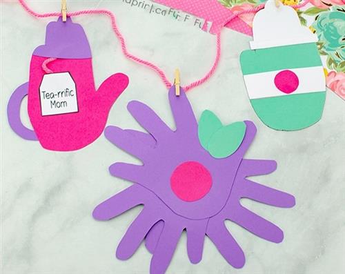 This paper banner for Moms features a Teapot, Flower, and To Go Coffee Cup. They are all made using paper cutouts in the shapes of the child’s hand. The colors can be changed up and it can be any length with repeated items or kids can come up with their own ideas to add to it. You can also use these to make cards.