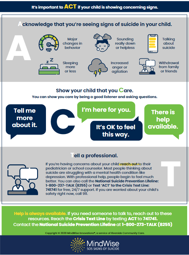 This is a document that outlines risk factors, warning signs, what to do if your child is contemplating suicide. If you or someone you know is suicidal, get help immediately via 911, the National Suicide Prevention Lifeline at 1-800-273-TALK or the Crisis Text Line (text “HOME” to 741741).