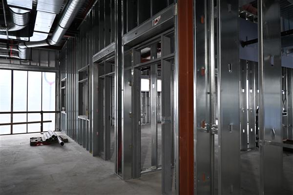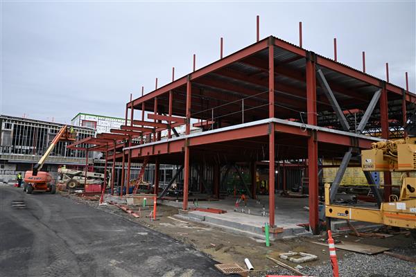 August 8, 2025: The final slab-on-grade concrete pour for Phase I took place this morning and the dumpster area retaining walls were poured as well. Steel erection continues. The sanitary sewer tie-in is complete. Layout for wall framing is underway. Work to set electric vaults is planned for next week, along with extending the gas line to the new building. The city has completed their water line work.