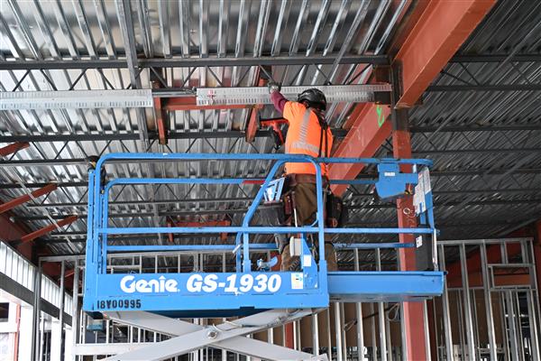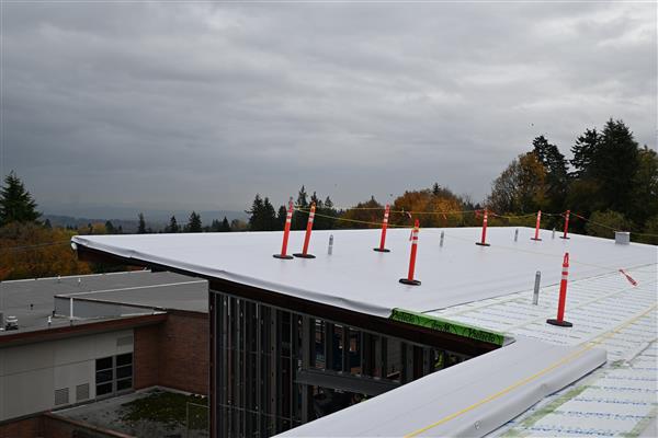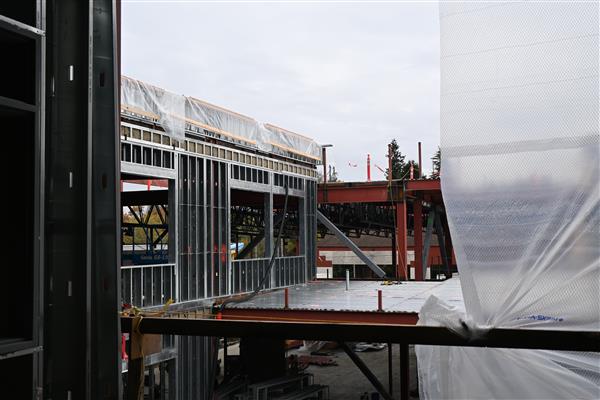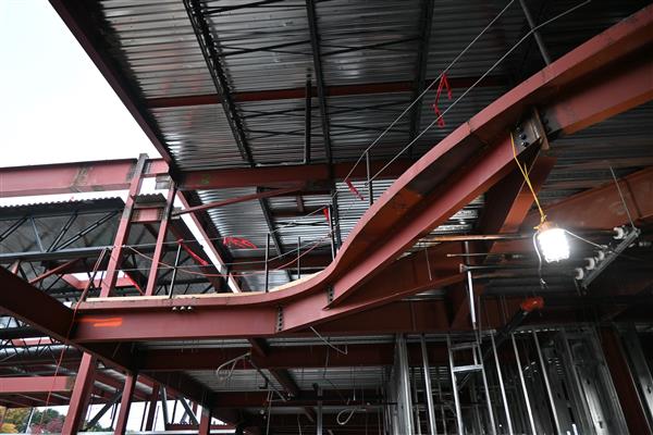 September 3, 2025: The first slab-on-metal-deck took place today, encompassing a little more than half of the second floor of the classroom wing. Steel erection continues in the area of the administrative office and library above it. The electric vaults were set and the service area was restored to functional use prior to the start of school. The plumber and sheet metal contractors have placed hangars in the ceiling space above the first floor of the classroom wing. A coordination meeting was held today with the sub-contractors for the building envelope.
