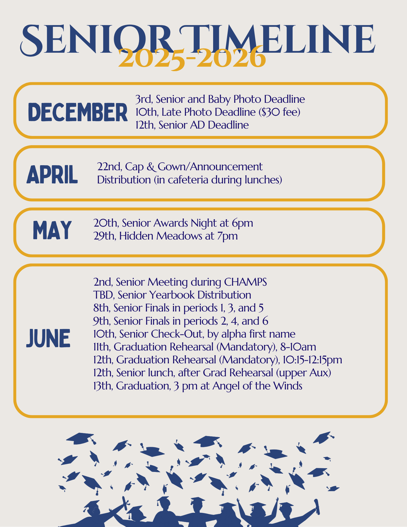 The school year is flying by, and senior planning is in full swing! Click the tabs on the left for more information regarding senior yearbook requirements, cap and gown ordering, graduation ceremony details, and more!