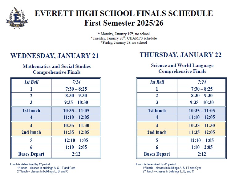 Semester One Finals will take place Wednesday through Thursday, January 21-22. We will follow a Monday/Wednesday bell schedule those days to support a focused and consistent testing environment. Click above to view the bell schedule.