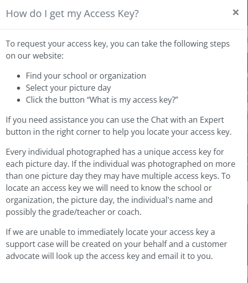 Please follow the instructions below on how to get your access key. The school does not have access to this confidential private information.